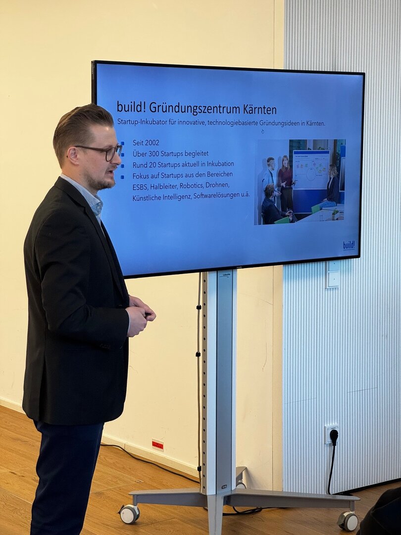 Als zweiter Speaker gab Christoph Riegler vom build! Gründungszentrum Einblicke in die Startup-Welt Kärntens. build! begleitet innovative, technologiebasierte Gründungsideen von der ersten Idee bis zur Markteinführung – mit individuellem Coaching, Zugang zu Förderungen, einem starken Netzwerk sowie Co-Working-Spaces in Klagenfurt und Villach. Besonders betont wurde die Rolle von Kooperationen zwischen Startups, etablierten Unternehmen und Forschung.
